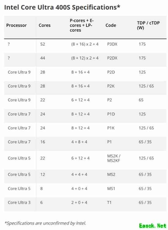 功耗方面,Intel新增175W满血档位,专供52核、44核旗舰,相比当前酷睿Ultra 9 285K基础功耗提升40%。主流解锁版维持125WTDP,同时保留65W、35W低功耗版本,覆盖全场景装机需求。