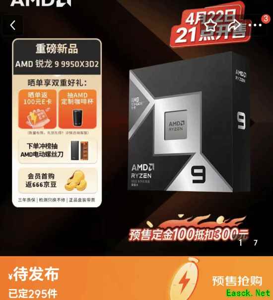 AMD于2026年4月正式发布了全新的旗舰桌面处理器锐龙9 9950X3D2,如今这款处理器已上架各大电商平台,将于4月22日正式开售。