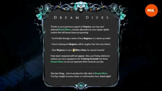 在“梦境深潜”模式下,玩家将使用训练场中当前装备的配置,与普通模式相同。完成区域后,玩家将获得新货币,可用于兑换特殊奖励。不过,大多数其他资源不会掉落,而且“没有闲聊时间”:选择增益效果和守卫战前的对话将被跳过,直接进入战斗。