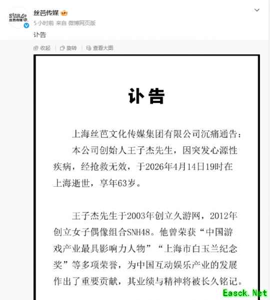 今日,一则重磅消息在游戏圈传开:久游网创始人,丝芭传媒集团总裁王子杰,因突发心源性疾病,经抢救无效逝世,享年63岁。