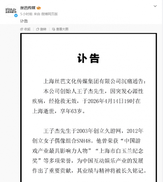 今日,一则重磅消息在游戏圈传开:久游网创始人,丝芭传媒集团总裁王子杰,因突发心源性疾病,经抢救无效逝世,享年63岁。
