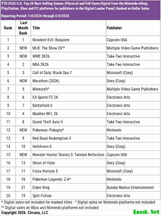 今日,根据Circana数据,《生化危机9:安魂曲》成为美国第一季度销量最高的游戏!