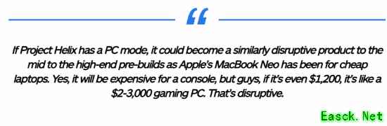 不过,据知名爆料人Moore’s Law Is Dead在播客中透露,Project Helix完全值这个价——它的性能可媲美2000至3000美元的高端游戏PC。“如果Project Helix有PC模式,它可能成为对中高端预装机市场具有颠覆性的产品,就像苹果MacBook Neo对廉价笔记本市场的冲击一样。即便售价1200美元,它也相当于一台2000到3000美元的PC,这将是颠覆性的。”
