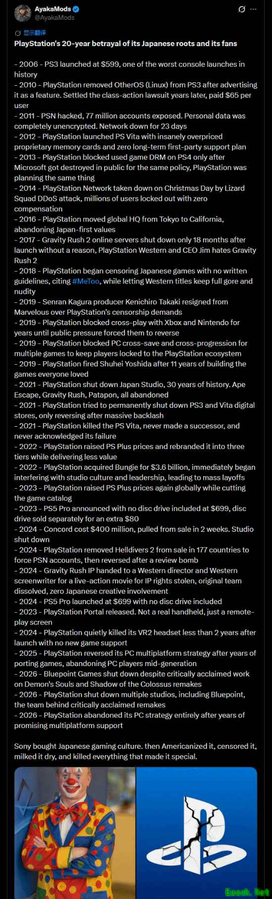 近日,一位国外玩家在社交媒体上发布长文,细数索尼PlayStation自2006年以来的“数宗罪”,包括硬件定价、网络安全、跨平台策略以及对日本工作室和开发者的影响。指出其偏离日本游戏文化根基和对粉丝的不公,引发大量玩家共鸣与争论。