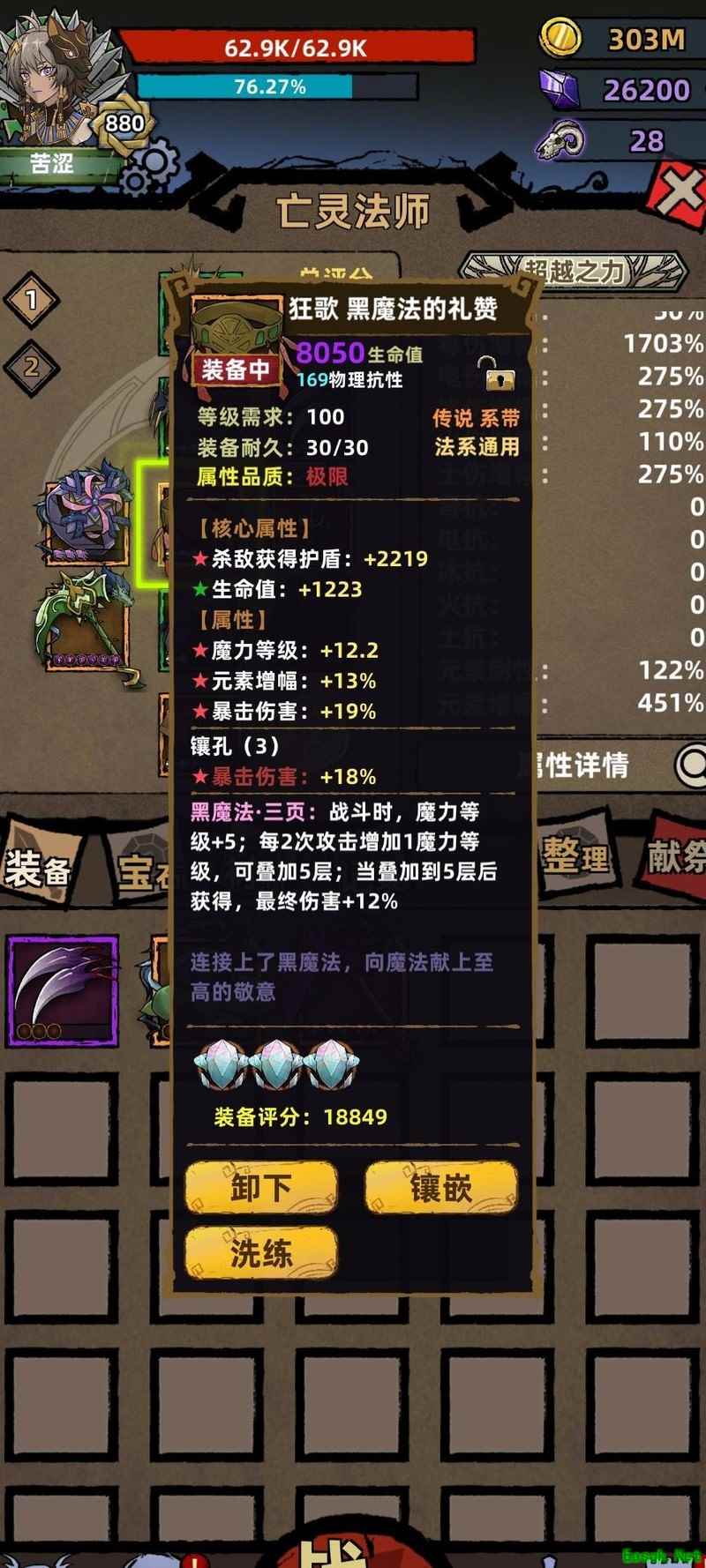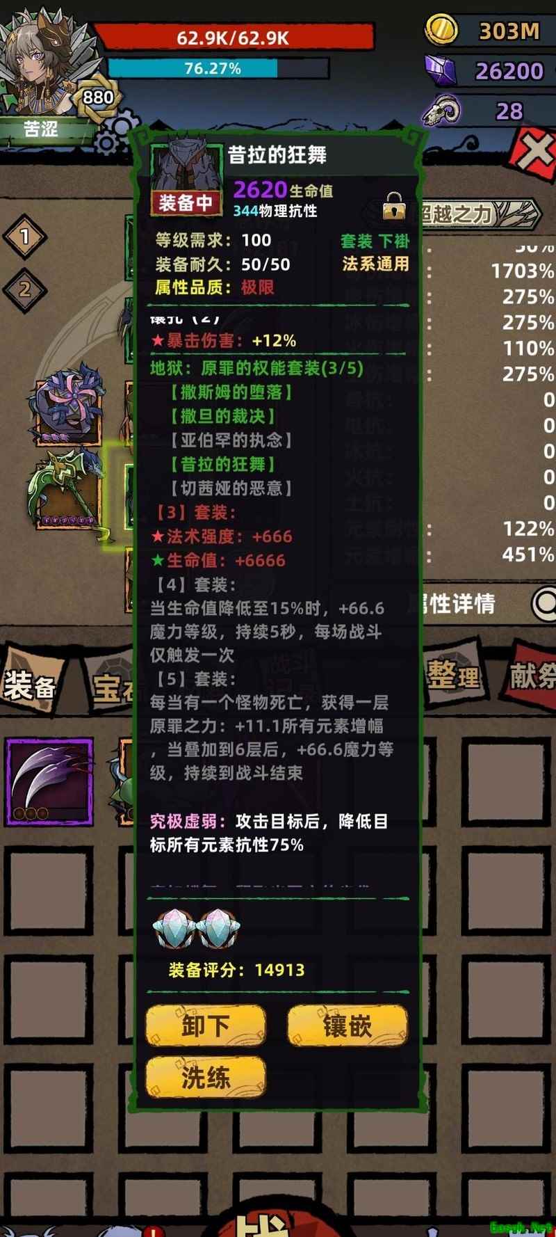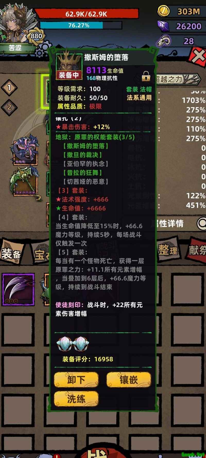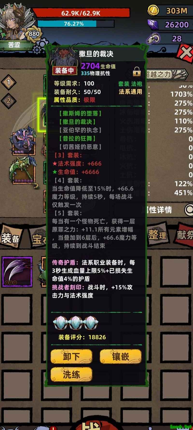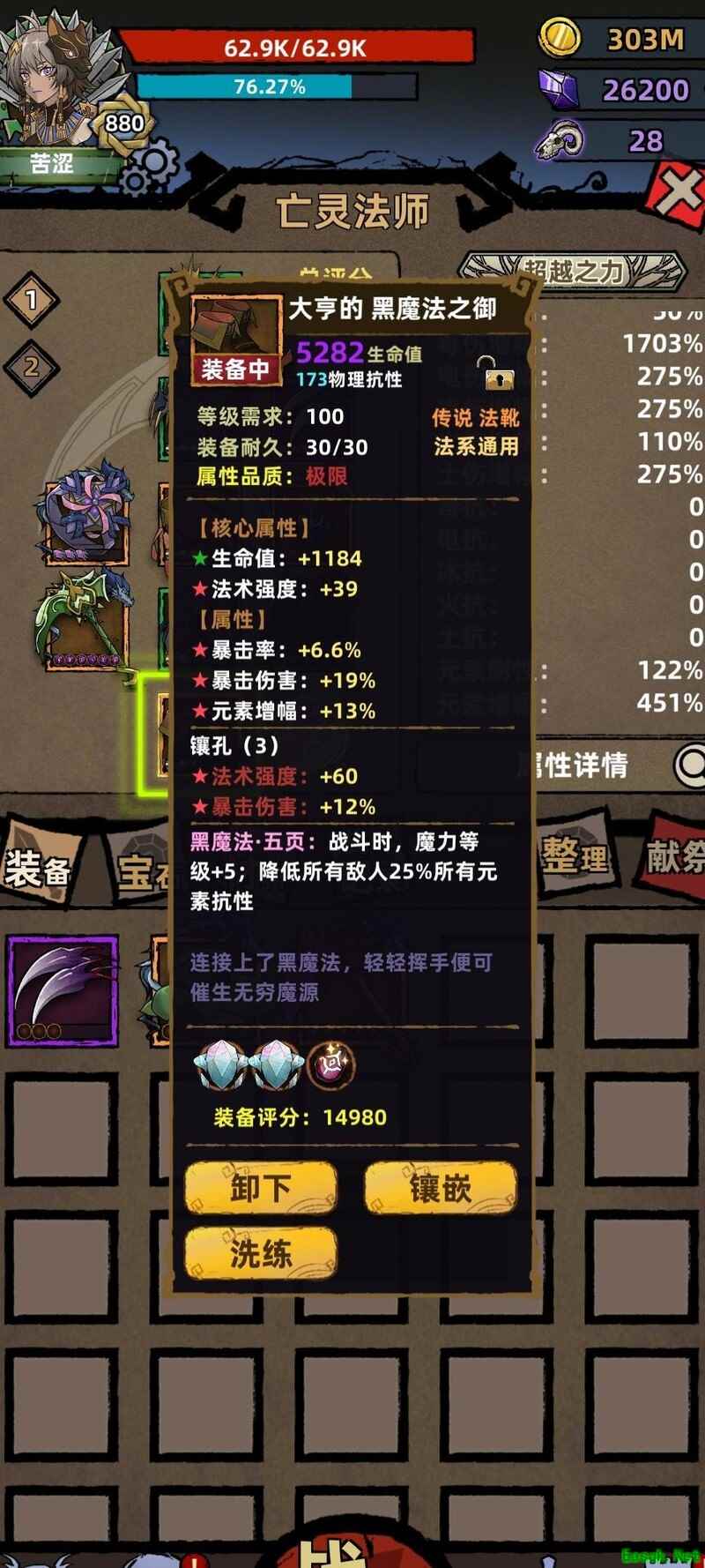 在套装搭配上,我并未选用英菲或暗金套装,而是选择了地狱三件套:头盔、上衣与裤子。头盔提供22点全元素增伤,上衣增加15%法术强度,裤子可降低75%目标抗性,再搭配黑魔法之御鞋子的25%抗性削减,使伤害接近真实伤害。腰带则选用黑魔法腰带,进一步提升输出能力,整体配置显著增强实战表现。