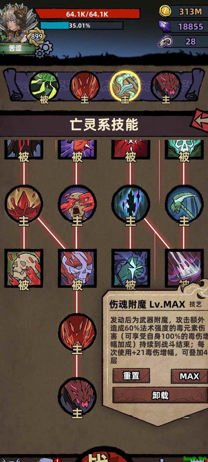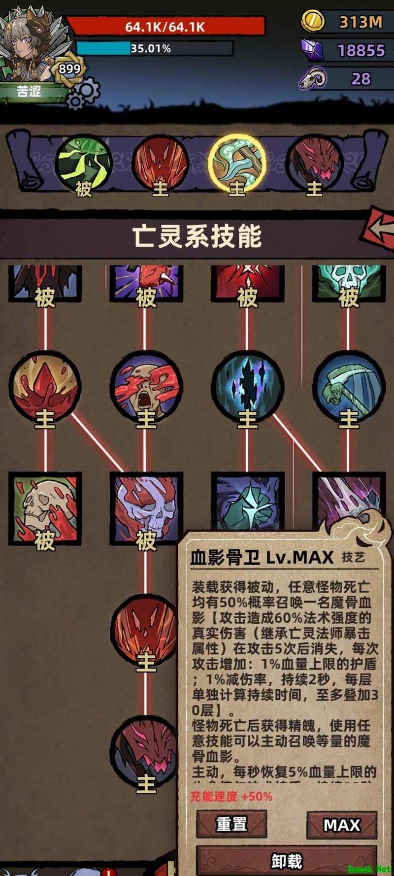 在技能搭配上,由于采用的是毒伤平A流派,因此伤魂附魔为必备选择,这一点无可争议。为了提升在高难度环境下的生存能力,避免开局暴毙,我选择了魔血翻涌作为辅助技能,其释放后可提供高达35%的减伤效果,显著增强站场稳定性。关于终极技能的取舍,由于本流派不依赖召唤物进行输出,镰魔并非最优解。亡者之握虽能通过被动提升魔力等级以增强伤害,但当前体系输出已足够可观;相比之下,血影骨卫提供的护盾与额外减伤更契合生存需求。综合考量,选择血影骨卫能在保证输出的同时有效提升容错率,整体表现更为均衡可靠。