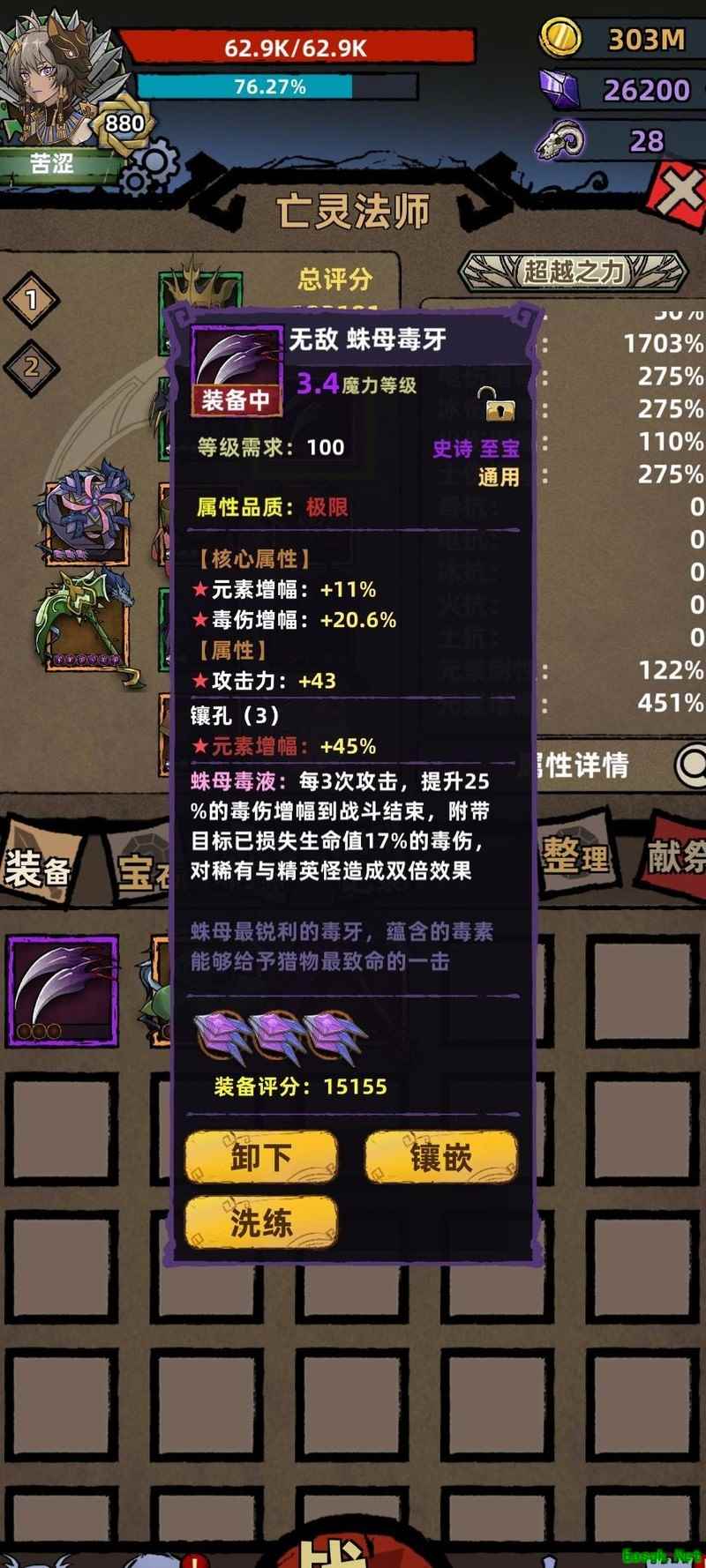 蛛母毒牙为至宝,通关第四或第五周目2-5关击败Boss有几率获得,极品难出,建议优先选择三孔属性。
