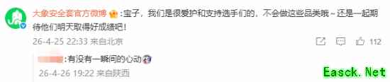 随后大象官方下场回复:宝子,我们是很爱护和支持选手们的,不会做这些品类哦~还是一起期待他们明天取得好成绩吧!