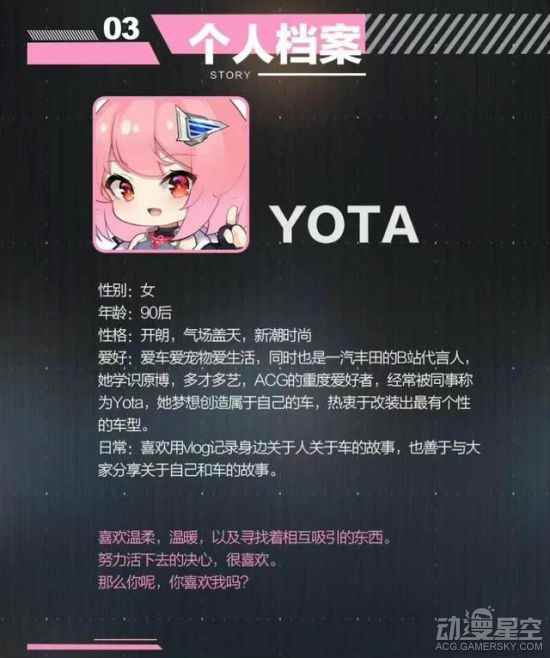 现在真的是万物皆可二次元,一汽丰田发文推出了美少女虚拟形象Yota酱。Yota酱是丰田B站账号的代言人,设定是开朗有气场,喜欢汽车喜欢二次元,而且还是九零后,是个知性稳重的御姐。 其实关注这个的朋友们会发现Yota酱在一个月前就出现过了,当时还做了个主题痛车,上路的效果还是挺不错的。 |
