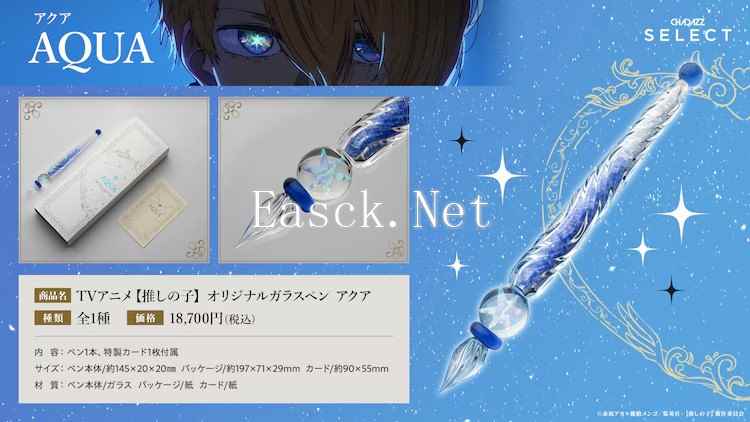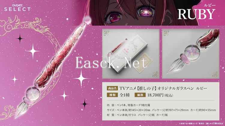 根据赤坂アカ和横槍メンゴ原作的TV动画《我推的孩子》,两款以Aqua和Ruby为设计灵感的玻璃笔即将发售,每款售价为含税18,700日元。这两款玻璃笔的笔尖部分分别装饰有Aqua和Ruby标志性的星星眼,笔身长度约为14.5厘米。购买每支笔还将附带一张特典卡片,并且产品将采用原创包装。特别设计的包装盒在组合Aqua和Ruby两款时会形成一个心形图案。 商品的预订将于11月9日中午12点开始,至11月30日23点59分结束,通过CHARAZZ网站接受预订。预计购买者将在2025年4月收到商品。由于是限量发售,一旦达到预定数量,即使在预订期间也可能提前结束销售,因此有意购买的消费者需注意及时下单。 |