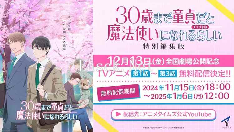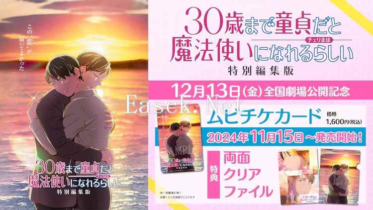 根据丰田悠原作制作的动画《到了30岁还是处男,似乎会变成魔法师 》(又称《チェリまほ》)的特别编辑版主视觉图和预告片已公开。该特别编辑版将于12月13日在日本全国影院上映。主视觉图展现了主角安达和黑泽在夕阳下的海边拥抱,戒指闪耀着光芒。预告片中包含了TV动画中未描绘的新画面。此外,由小林千晃、铃木崚汰、古川慎、佐藤元四人演唱的片尾曲《Love Candle》也在预告片中首次亮相。 从11月15日起,部分影院和在线商店将销售使用主视觉图设计的Movie Ticket卡,购买者将获得附带特别设计的透明文件夹作为特典。同日,部分Animate店铺和在线商店将销售附带透明海报的Movie Ticket卡。从12月13日起,Animate部分店铺将开展海报赠送活动。动画官方网站将提供具体的获取方式。 此外,动画时报官方YouTube频道宣布,从明日开始至2025年1月6日,将免费播放TV动画《30岁如果还是处男,似乎就能成为魔法使》的第1话至第3话。监督奥田佳子和系列构成金春智子也对此发表了评论,表达了对作品的热爱和对观众的期待。 |