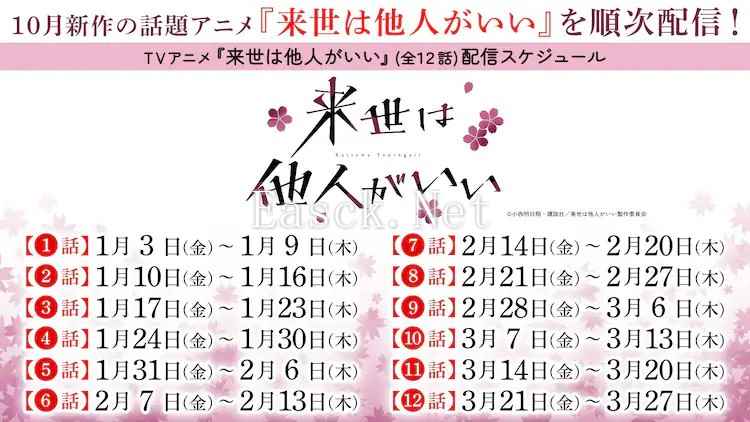 根据小西明日翔原作制作的TV动画《唯愿来世不相识》的全部12话将从1月3日起至3月27日,在讲谈社运营的YouTube频道“FULL☆アニメTV”上免费陆续公开。该动画自2024年10月起在TOKYO MX、BS11、AT-X播出,并于2024年12月末播出最终回。免费公开的安排是,每周五开始依次公开一话,每话限时一周。《来世は他人がいい》讲述了拥有黑道家族背景的吉乃,在与相亲对象霧島居住的関東最大黑道家族“砥草会”的深山家共同生活的故事。原作单行本目前已发行至第8卷。 |
