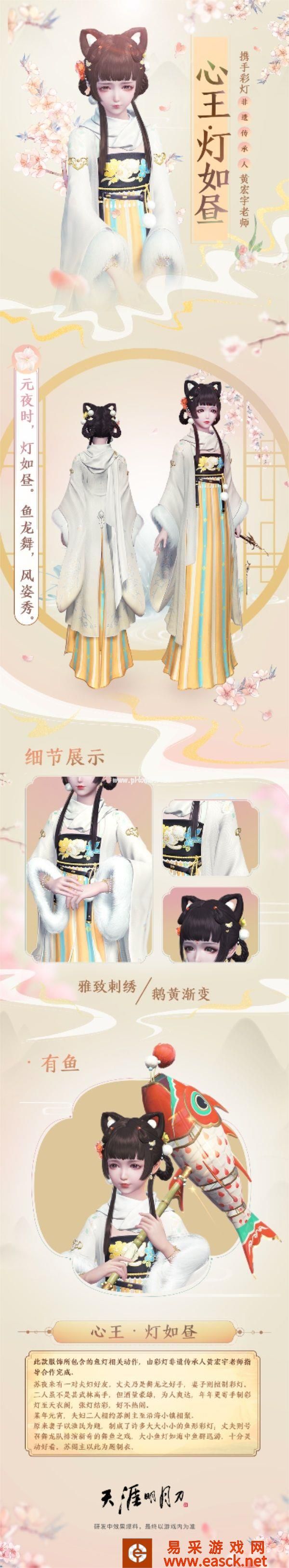 以白色为主基调,领口、肩部、裙摆都以别致的吉祥花纹刺绣点缀,少女和成女加入了许多毛绒元素,在冬日里看上去十分温暖。成男精神干练的发型和整体剪裁也让人眼前一亮。 外观附赠交互技能【有鱼】,少侠使用技能后可举起鱼灯行走。 在靠近其他游鱼队伍时,选中当前队伍的队尾玩家,点击【游鱼】按钮即可加入游鱼队列自动举灯跟随。 刀哥已经预想到一群少侠在开封街头排成一条长长的队伍到处走了~