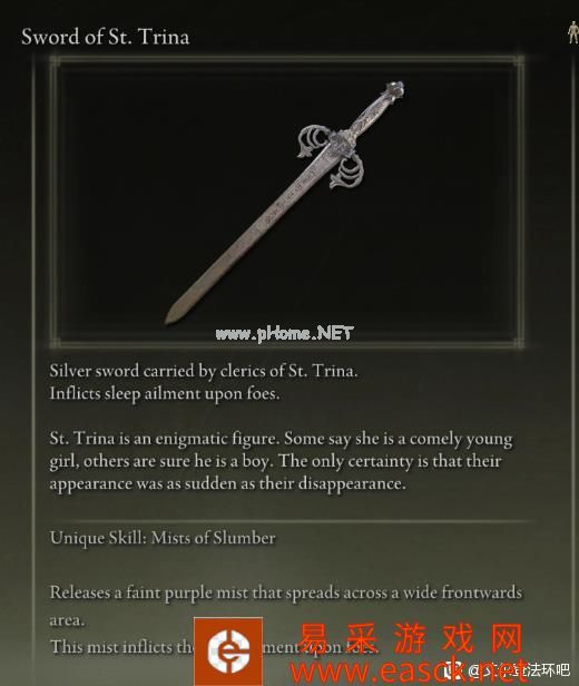 艾尔登法环中圣崔娜之剑十分强势,部分玩家可能不清楚怎么玩,下面一起来看看艾尔登法环圣崔娜之剑战技效果一览吧。 艾尔登法环圣崔娜之剑战技效果一览 圣崔娜之剑 圣崔娜神职人员所持有的银剑,可以使敌人陷入睡眠之中 圣崔娜是一个神秘的人物。有人说她是一个漂亮的年轻女子,也有人认为他是个男孩。唯一可以确定的是,他(她)们的出现和消失一样突然。 技能:沉眠的迷雾 释放出一股淡淡的紫色薄雾,扩散到前方的广阔区域,雾气会使敌人患上睡眠