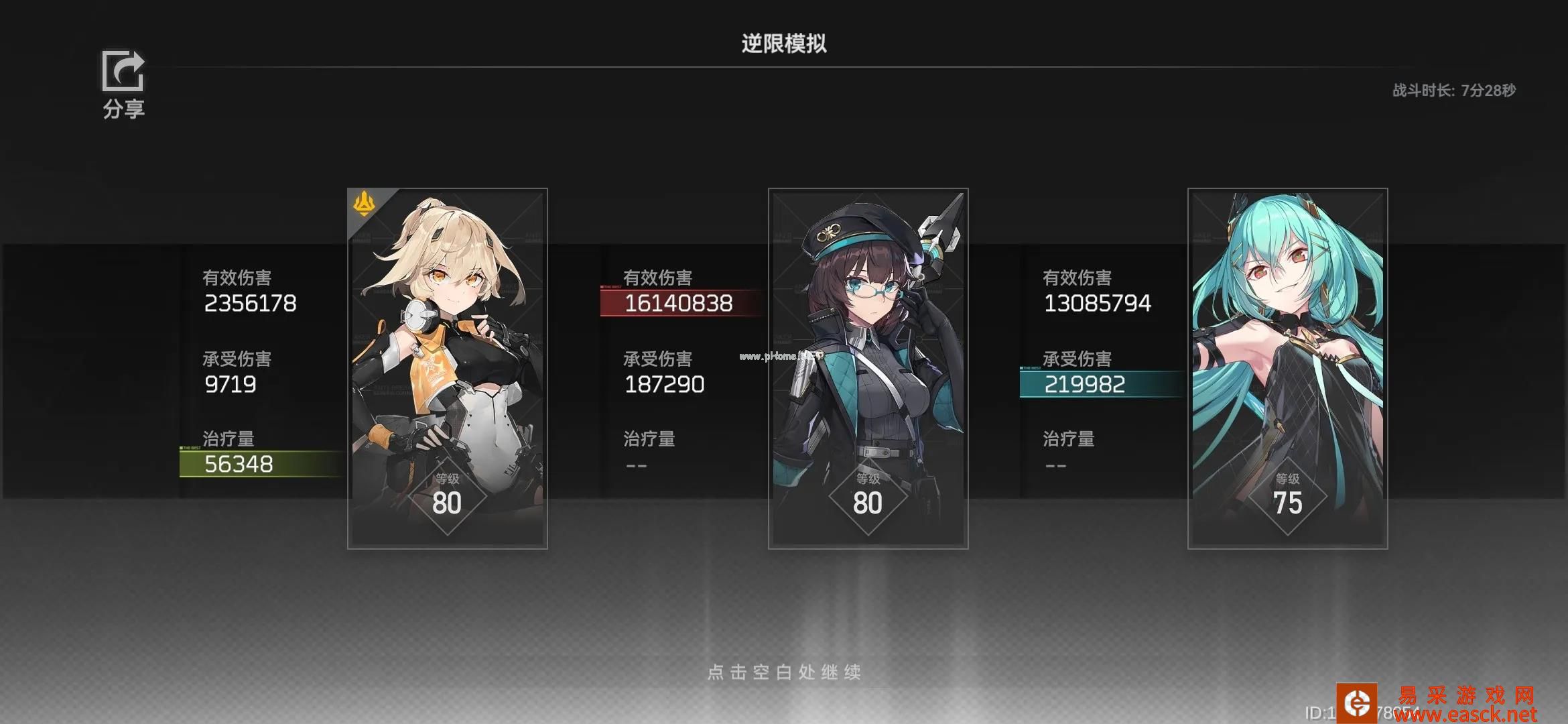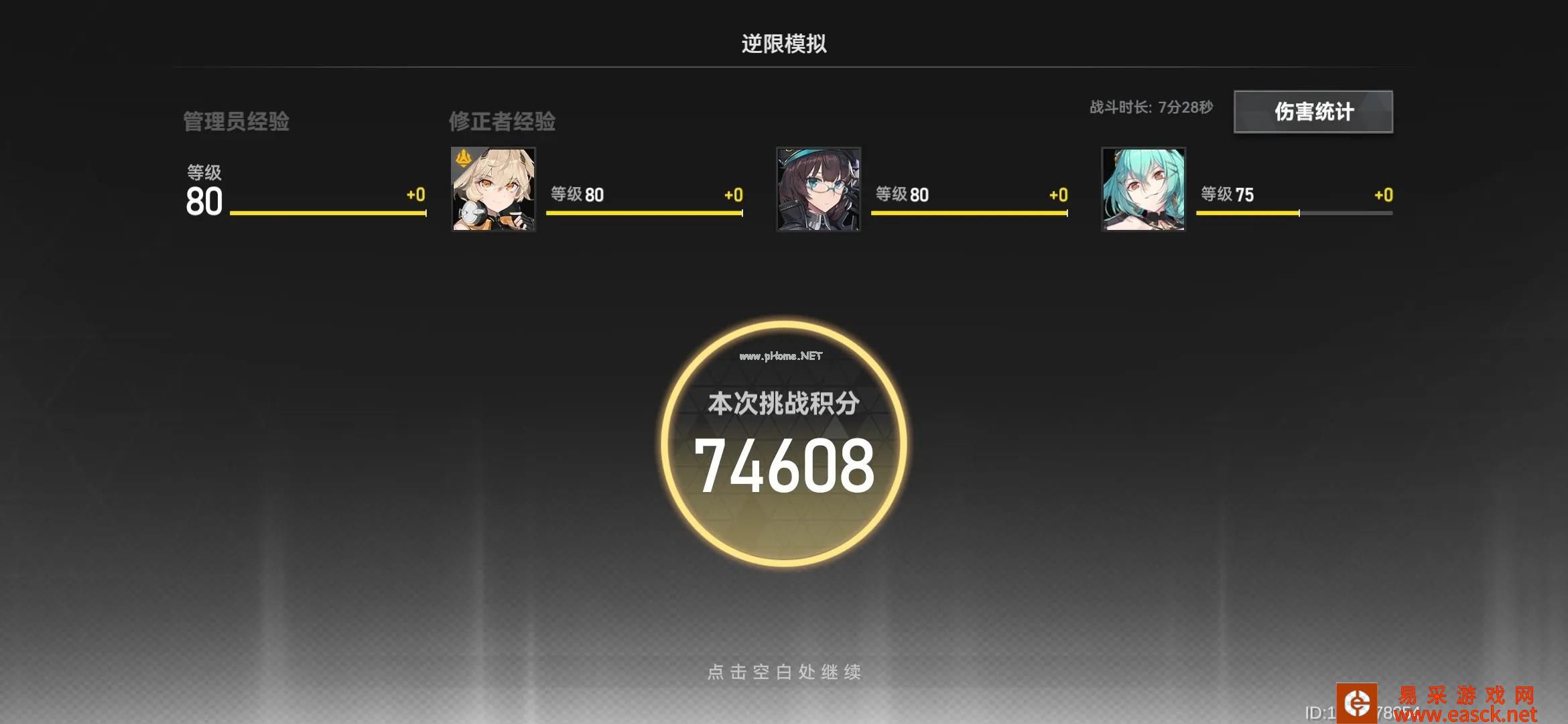 深空眼逆限模拟高分攻略。许多玩家可能不知道如何在游戏中刷高分。以下是玩家参考的具体策略。 逆限模拟高分攻略 由于伤害问题,平民想在凹时打72000分,基本上等于做梦,那么怎样才能让每个人都得到72000分呢? 答案是凹伤!(虽然时间对分数也有影响,但最大的影响是伤害。 那怎样才能轻松地凹受伤呢? 答案是流行,通过流行2技能提供的高额移速,可以避免整个过程中的所有伤害, 先说配队,我自己,sss风行、 Ω风枪(专)s冥王,猫复活猫(即粉猫) 这种组合可以保证你ai不死,让你无忧无虑的躲伤,卡bug(bushi) 图中我随手打了7分多钟,受伤小1万,分数74608,全程逃课。再残疾的人也可以打满