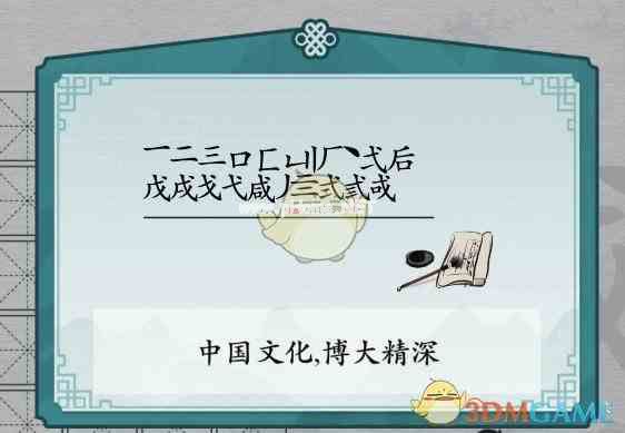 《离谱的汉字》咸找20个字通关攻略1、【咸】找20个字,分别是: 一、二、三、口、匚、凵、丨、厂、丶、后、戊、戌、戈、弋、咸、丿、亖、弌(yī)、弍、弎、戓(gē) 2、【咸】中间有一个口字,口可以拆分出匚、凵;右边的点是丶,竖是丨,横是一、二、三、亖 3、【咸】左边是厂字,去掉撇、再去掉里面一横是戓,外面的部首是戈,戈去掉一横是弋,还可以找出弌(yī)、弍、弎、戊、戌等字