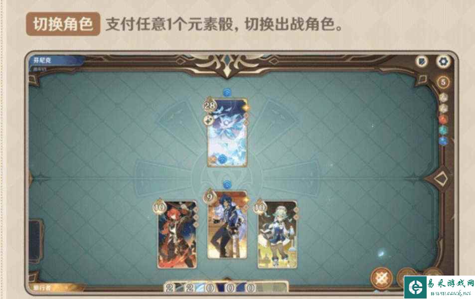 ①切人价值 切人是需要花费一个骰子的,从全局视角来看,如果整局都不切人,是最赚骰子的方式,因为一个角色死亡后,会免费切换一次,相当于赚了一骰。所以主动切人的收益至少要大于一骰子,才会考虑切人。 ②进攻切 以进攻为目的的切人,比如为了触发元素反应,或者切换到充能满的角色来释放大招,这种进攻切是非常常见的,通过触发元素反应,或者击杀对手关键角色来获得巨大收益。 ③防守切 为了让前台角色不死亡从而进行的切人操作,这种操作前要首先思考对方斩杀线,然后考虑切换到哪一位角色来承受更合适。 还有另一种防守切,是为了让对方不触发元素反应,让对方战术落空,这种收益不一定很高,所以要具体情况具体分析。 1.6 使用手牌