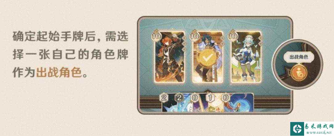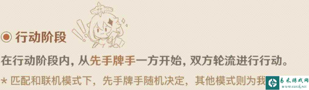 ①先手: 开局的先手具有先动权,假定双方镜像操作,可以率先完成击杀,对于很多卡组来说,可以全局保持住自己的先动权,这种卡组如果先手开局就获得了一定的优势。 ②后手: 开局的后手具有后发制人的特性,假定双方镜像操作,每个大回合先手方会率先结束自己的回合,结束回合后不能再进行切人等操作,此时后手方可以尽情输出,先手方无法反制。同时,有些角色,例如行秋,后手可以通过元素战技来消除身上的元素附着,打乱对手的进攻节奏。 1.2 选定前台角色