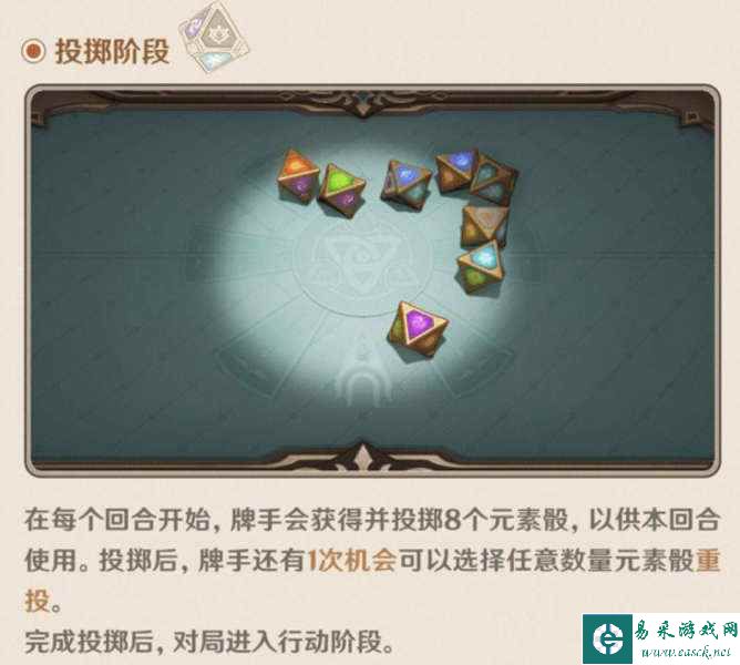 ①先手: 由于先动优势,可以直接选择己方开大工具人(例如行秋,霄宫等)上场,快速积攒能量,先手方不用太担心己方二充能角色在开大之前被秒掉,所以可以直接上场。 ②后手: 由于后动,需要考虑对方的斩杀线,如果对方卡组爆发比较高,我方前台角色可能被直接秒掉,可以先上场一个其他角色,让他为我们接下来上场的开大工具人吃一次伤害,可以保证我方开大工具人能够在被击杀之前开出大招。 1.3 投掷阶段