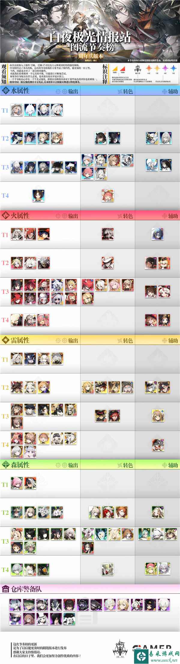白夜极光国服节奏榜。不少玩家可能还不太清楚这里的强度排名,下面带来具体的介绍,供各位玩家们参考。 最强角色排名 1、此为国际服1周年版本节奏榜,国服没出的角色直接忽略即可,也可做千里眼使用。 2、本次直接加入了薇丝·空瞳,巴顿·芒刃以及大元帅莱因哈特的强度梯级。 3、节奏榜经过了多次改版,这次的节奏榜我们主要考虑了简约性,能更加的一目了然当然,因此也舍弃了一部分的功能性。对此我们很难做到一个完美的平衡,只能进行不断地尝试。如果各位导航员有什么意见,也欢迎直接在评论区留言。 4、一千个导航员心中有一千个光灵强度,即使在攻略组内部对于某些角色的评价也很难统一 5、榜单中同一阶层强度排序不分先后,且本榜单不会根据灾典进行特化排名。