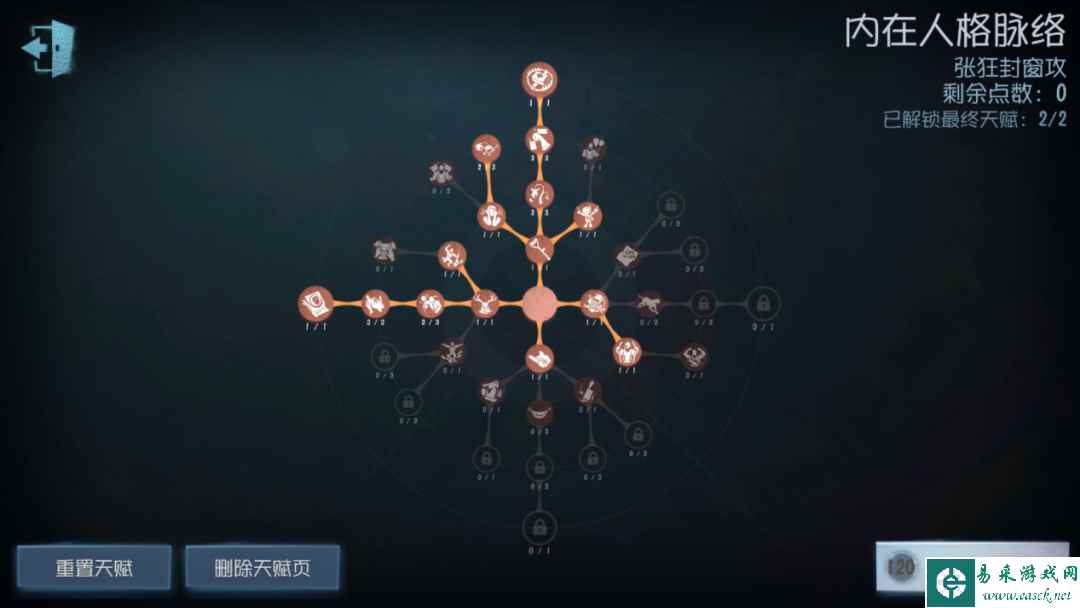 推荐辅助特质:【闪现】 之所以带封窗主要是因为地图原因,主要是在湖景村、军工厂、永眠镇这种地图中的一些特别点位,例如湖景村大船一楼,军工厂大房,求生者一旦转进去,我们就只有老老实实绕圈追击的份,所以带个封窗来防止无限的建筑物跑圈。而且如果你前期击倒够快,完全可以将闪现留着,看是选着追双趴还是求稳先挂飞一个都是可以的,把主控权放在我们自己手上。 天赋推荐三:【张狂】+【幽闭空间】+【掌控欲】+【困兽之斗】+【惯性】+【念旧癖】+【狂暴】