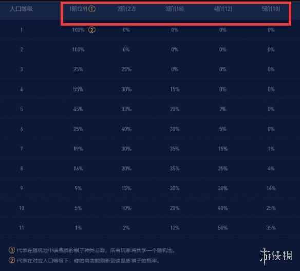 二、概率一览 1级:1费100%、2费0%、3费0%、4/8费0%、5/10费0% 2级:1费100%、2费0%、3费0%、4/8费0%、5/10费0% 3级:1费75%、2费25%、3费0%、4/8费0%、5/10费0% 4级:1费55%、2费35%、3费15%、4/8费0%、5/10费0% 5级:1费45%、2费33%、3费20%、4/8费2%、5/10费0% 6级:1费25%、2费40%、3费30%、4/8费5%、5/10费0% 7级:1费19%、2费30%、3费35%、4/8费15%、5/10费1% 8级:1费16%、2费20%、3费35%、4/8费25%、5/10费4% 9级:1费9%、2费15%、3费30%、4/8费30%、5/10费16%