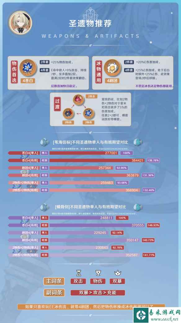 “沙”是圣遗物时之沙部位的简称;“杯”是圣遗物空之杯部位的选择;“头”是圣遗物理之冠部位的选择。 上图推荐了3种圣遗物套装搭配: 物伤流以4苍白为主,然后可用2苍白+2骑士过渡。4苍白共可提供18%攻击和50%物伤,且触发超级容易,菲米尼eQA就触发满层了。相对2苍白+2骑士,4苍白也就多了18%的差距。当然也可用4剧团,2苍白+2骑士也就比4剧团多了5%的物伤加成,但是4剧团无法加持A,而2苍白+2骑士和4苍白可加持A,上文已计算A的倍率还是挺高的,能别丢咱就别丢。 冰伤流以4剧团为主,然后可用2剧团+2冰风过渡。4剧团共可提供45%的伤害加成,而2剧团+2冰风就少了5%的伤害加成,差距不打,且相对来说2+2会比4件套更容易成型。 主词条方面,物伤流与冰伤流都是在空之杯部位有差别,物伤选物伤杯,冰伤选冰伤杯。时之沙绑定攻击沙,理之冠根据佩戴的武器以及面板角色暴击头或暴伤头。 副词条方面都是通用的优先考虑双暴其次考虑攻击,能有充能最好,没有咱不强求。 以上就是关于原神菲米尼圣遗物推荐的全部内容了, 希望能够帮助到各位玩家。 |