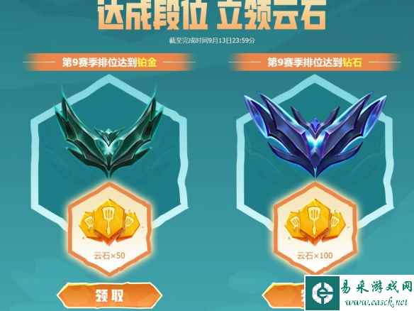 三、冲刺段位领取云石 1、s9排位达到铂金可领取50云石。 2、s9排位达到钻石可领取100云石。