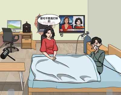 通关攻略: 1、点击“电脑”,再点击电脑里面的学习资料; 2、点击电视出现“相亲新闻”; 3、点击“手机”; 4、点击电脑桌下的“抽屉”,点击抽屉中的纸; 5、点击“药罐”; 6、点击抽屉下的“柜子”,点击柜子里的VIP卡; 7、点击“包包”,点击包包中的纸, 8、点击“氧气罐”,其实是煤气瓶; 9、点击“电击器”; 10、连续点击墙上的“合照”3下; 11、拖动“锤子”敲击相册后的保险箱,点击破碎的古董。