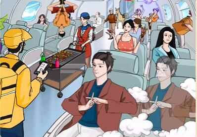老六爱找茬魔鬼航空怎么过1、空着飘着一个西服男; 2、飘着的人右边有两个人在蹦迪; 3、舱门处有一个人牵着马; 4、右边中间有一个比基尼女郎在晒日光浴; 5、右边最前方的男人在用分身占座; 6、比基尼女郎后排有人开窗探头; 7、蹦迪男右边的窗户有人在撘便机; 8、左边中间位置有人在倒挂金钩; 9、空姐推着烧烤车; 10、外卖员送货上飞机; 11、外卖员左边的有人在做黑暗料理; 12、倒挂金钩男左边的小姐姐会用出水口的水洗头。