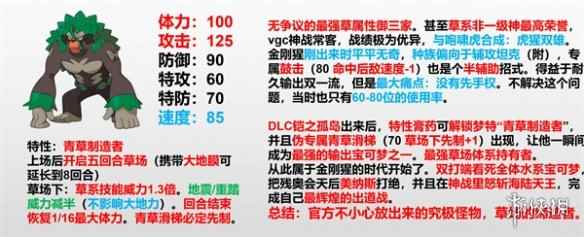 轰擂金刚猩作为2022VGC冠军宝可梦之一,其实力毋庸置疑,八代最强御三家实至名归,九代的轰擂金刚猩受到削弱,但依旧很强力,在九代的对战环境还是很能打,草主真正的排面。 宝可梦朱紫轰擂金刚猩分析1、轰擂金刚猩在八代DLC铠岛推出梦特药膏和青草滑梯之后,一跃成为草系最强宝可梦,VGC神战屠杀一级神,当时真的无解。