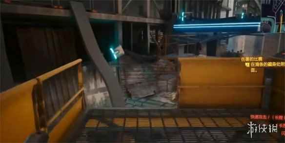 2、右转之后玩家就需要一直往前走,穿过各种障碍物走到一处钢铁平台,对面是一块扭曲的竖条铁板。
