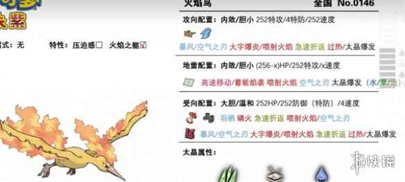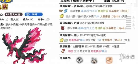3、伽勒尔火焰鸟就不一样了,恶+飞行属性,主流攻击配招怒火中烧+暴风/空气之刃+太晶爆发+急速折返/突袭。
