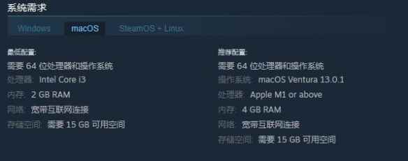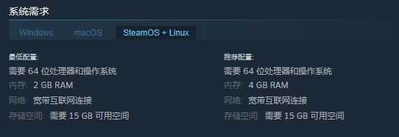 三、SteamOS + Linux 1、最低配置 需要64位处理器和操作系统 内存:2 GB RAM 网络:宽带互联网连接 存储空间:需要 15 GB 可用空间 2、推荐配置 需要64位处理器和操作系统 内存:4 GB RAM 网络:宽带互联网连接 存储空间:需要 15 GB 可用空间