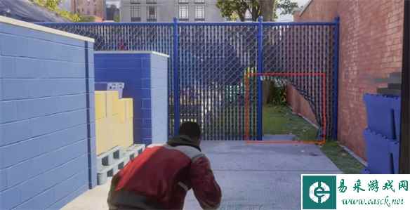 2. 然后从一个关上一半门的仓库缝隙进去,能看见破洞的铁丝网,同时可以听见校长的对话。