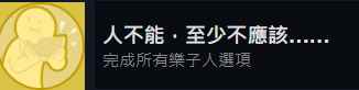 完蛋我被美女包围了这款游戏有很多成就可以达成,人不能至少不应该这个成就的介绍是要完成所有乐子人选项,所以玩家只要把所有搞笑的选项选一遍就可以了,选完所有搞笑的选项也需要走到结尾才解锁这个成就。