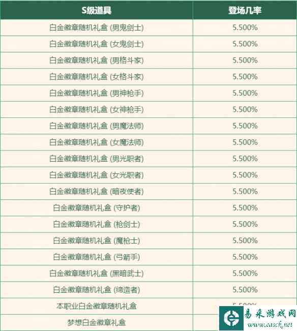 3、在每周商店中,每周都会更新1个白金徽章供玩家购买。 4、登场的徽章列表和几率如下图所示,玩家们可以根据自身需求购买。