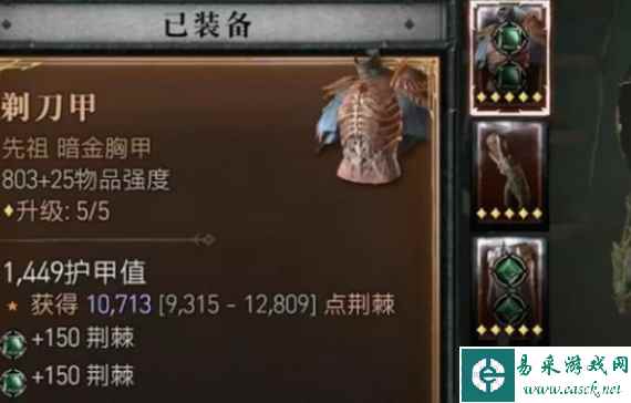 3、其中剃刀甲是食人族的阿摩达所制作的护甲,属于暗金护甲的一种,主要提供保护属性。 4、该护甲的总体属性加成相当不错,虽然获取并不困难,但它所附带的荆棘反伤效果是比较罕见的。 5、可以与职业中的野蛮人搭配进行反伤流派的玩法,能够显著提高其反伤效果。