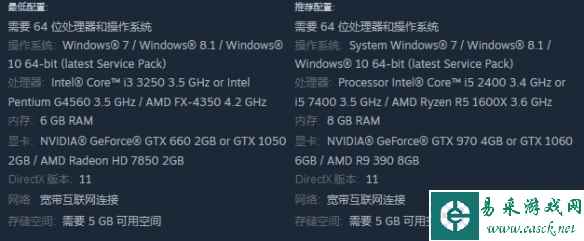 最低配置: 需要 64 位处理器和操作系统 操作系统: Windows® 7 / Windows® 8.1 / Windows® 10 64-bit (latest Service Pack) 处理器: Intel® Core™ i3 3250 3.5 GHz or Intel Pentium G4560 3.5 GHz / AMD FX-4350 4.2 GHz 内存: 6 GB RAM 显卡: NVIDIA® GeForce® GTX 660 2GB or GTX 1050 2GB / AMD Radeon HD 7850 2GB DirectX 版本: 11 网络: 宽带互联网连接 存储空间: 需要 5 GB 可用空间 推荐配置: 需要 64 位处理器和操作系统 操作系统: System Windows® 7 / Windows® 8.1 / Windows® 10 64-bit (latest Service Pack) 处理器: Processor Intel® Core™ i5 2400 3.4 GHz or i5 7400 3.5 GHz / AMD Ryzen R5 1600X 3.6 GHz 内存: 8 GB RAM 显卡: NVIDIA® GeForce® GTX 970 4GB or GTX 1060 6GB / AMD R9 390 8GB DirectX 版本: 11 网络: 宽带互联网连接 存储空间: 需要 5 GB 可用空间