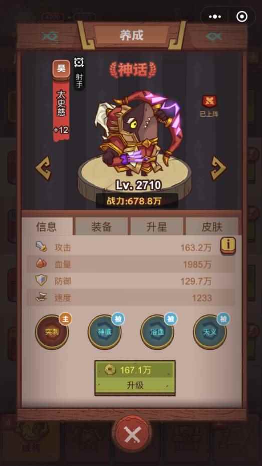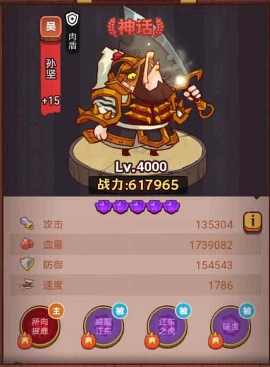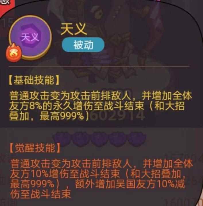 2、推荐打法 主要输出:太史慈是队伍中最重要的一个咸将,我们可以在资源稀缺的情况下主要对太史慈的装备进行升级,以及对太史慈本人进行提升。 推荐原因:依靠太史慈的被动技能,可以很好的给全队增加伤害。配合降低防御以及减怒打出非常高额的伤害。