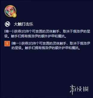 云顶之弈S10英雄羁绊有哪些 云顶之弈S10大触打击乐羁绊属性是什么大触打击乐羁绊组成:俄洛伊 羁绊属性: 获得2/2/8个可放置的灵体触手,取决于俄洛伊的星级。触手们拥有俄洛伊的额外护甲和魔抗。