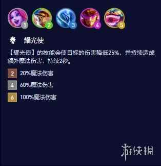 云顶之弈S10英雄羁绊有哪些 云顶之弈S10耀光使羁绊属性是什么耀光使羁绊组成:娜美、巴德、拉克丝、崔斯特、吉格斯 羁绊属性: 耀光使的技能会使目标的伤害降低25%,并持续造成额外魔法伤害,持续2秒。 2 20%魔法伤害 4 60%魔法伤害 6 100%魔法伤害
