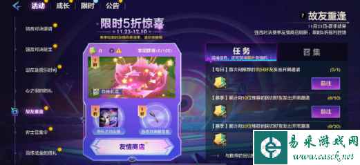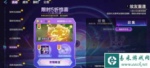 完成活动【故友重逢】相应任务获得友情币,友情币可兑换友情商店奖励。 【活动时间】 2023年11月23日-赛季结束 【活动奖励】 【攻击特效自选礼盒】、【音乐之约 头像】、【强音对决 徽章盒】、【星之碎片】、【蓝色宝石】 【活动入口】 游戏主页面--事件--活动--故友重逢