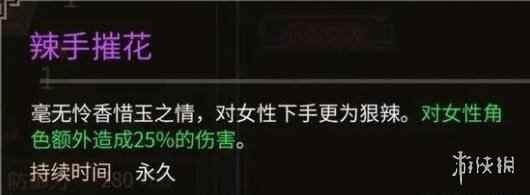 效果:毫无怜香惜玉之情,对女性下手更为狠辣。对女性角色额外造成25%的伤害。 持续时间:永久 小提示:两个都想拿的话,可以在都在破庙杀就好了。 以上就是关于大侠立志传嫉恶如仇天赋解锁方法的相关分享,希望对大家游戏有帮助。