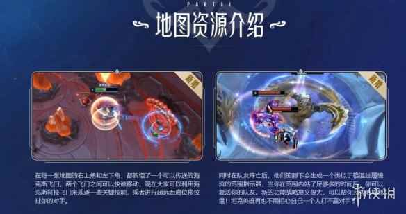 三、地图资源介绍 1、在每一张地图的右上角和左下角,都新增了一个可以传送的海克斯飞门。两个飞门之间可以快速移动,现在大家可以利用海克斯科技飞门来规避一些关键技能,或者进行超远距离位移拉扯你的对手。 2、同时在队友阵亡后,他们的脚下会生成一个类似于格温丝履缠流的范围指示器,当你在范围内站了足够多的时间后,你可以复活你的队友。新的功能战略意义很大,可以帮你完成绝境翻盘!坦克英雄再也不用担心自己一个人打不赢对手了!