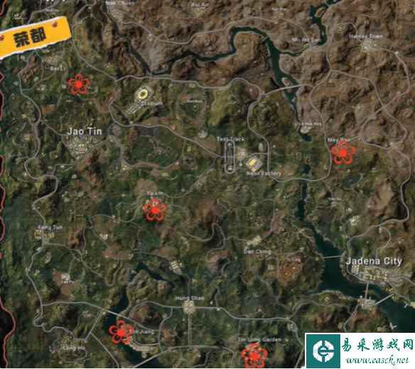 1、玩家开启一把荣都地图后,跳伞来到图中的标记位置。