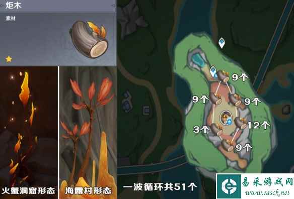 炬木 炬木作为枫丹最特别的树种,其在枫丹的数量仅次于白梣木,独特的两种外形,以及特殊的分布范围,甚至让很多旅行者至今不知道原来还有这种木头。 炬木主要分布在火蟹BOSS的洞穴旁以及海露村“很明亮的地方”。 这边的推荐路线是火蟹洞穴,沿着BOSS边缘一圈砍伐 注:在砍伐过程中,旅行者们需要注意场景中的开水,建议切一个奶在队伍里,谨防烫伤导致损失角色哦!