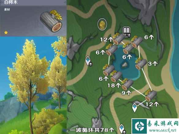 椴木 椴木在枫丹的分布非常分散,很多地方都只有零星几个,基本上很难找到一片的。 这边推荐路线是悬铃木与椴木的混合路线,在确保椴木收益的同时,还能获取到一定数量的悬铃木,比起单纯的砍伐椴木,这条路线的收益能最大化。 注:传送点只是去的时候传送过去,循环起来就不需要去传送点了哦,循环路线按照下方视频路线循环即可。