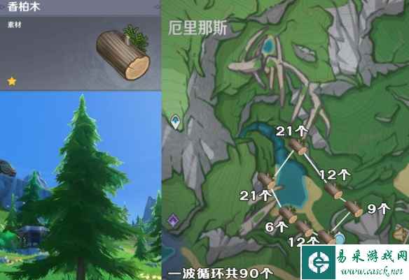 原神4.3枫丹五种树木砍伐路线香柏木 香柏木作为枫丹最常见的树种,其在枫丹的覆盖率非常惊人。 这边推荐在厄里那斯的七天神像旁,沿着海露村的入口的水池,进行循环砍伐。