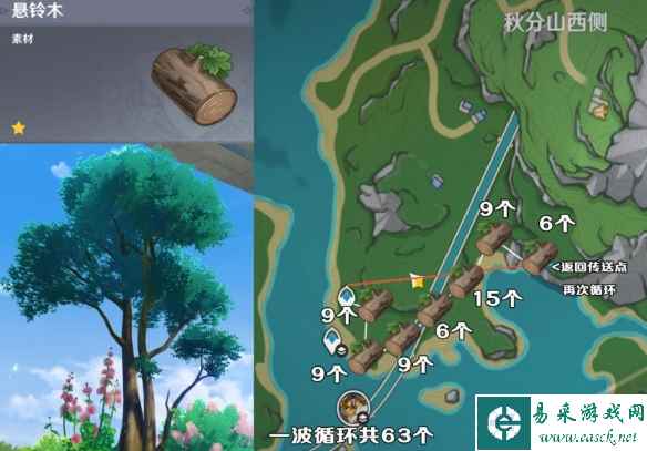 悬铃木 悬铃木作为枫丹第二多的树种,其分布范围虽然没有香柏木那么离谱,但是作为枫丹第二多的树木,依旧在枫丹大部分地区都能见到。 路线主要推荐的是秋分山沿海的路线,路线上的怪物推荐先清理干净哦~